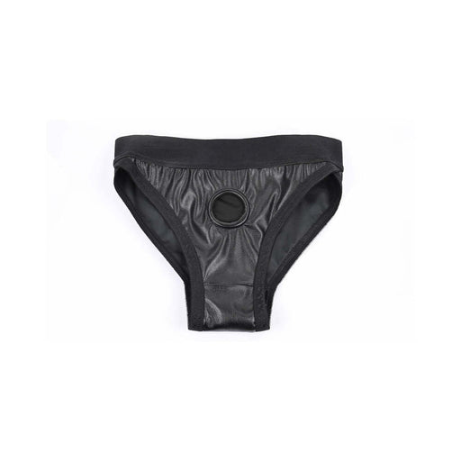$45Stretch faux leather and textured stretch mesh cropped bustier and strappy G-string set with geometric gold hardware accents Underwire double-layer...