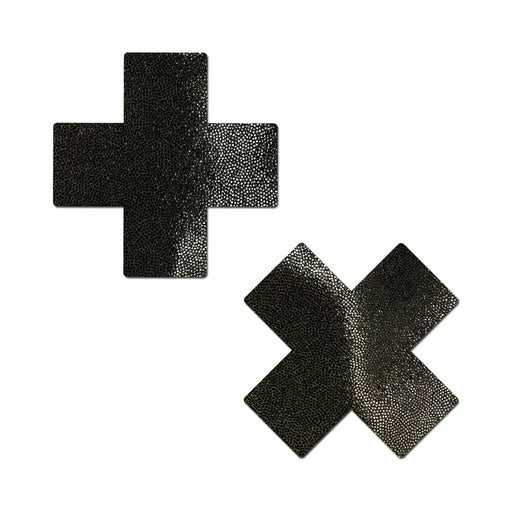 Pastease Plus X Faux Latex Black Crosses. Solids Nipple Pasties by Pastease are hand made in the USA of soft form fitting material that forms seaml...