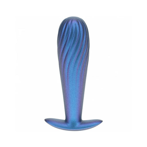 Discover the Ouch! Smooth Silicone Ribbed Anal Plug in a stunning metallic blue finish. Measuring 4.6 inches long, this premium silicone plug is de...