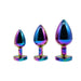 Tap and train your gorgeous butt with this set of 3 graduated chrome-plated aluminum anal plugs! You get 3 sizes, perfect for training your way from absolute anal beginner to butt-tastic expert. The shiny rainbow finish plus a sparkly rainbow jewel at the base are fantastic to look at – almost as fantastic as the smooth plugs feel sliding inside! Try heating or cooling the plugs, too, for thrilling temperature play. ABS faux jewel, chrome-plated aluminum plug. Includes Small, Medium and Large plugs.