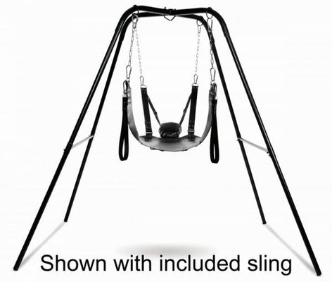 Easy to assemble whenever the mood strikes, this kit includes a sturdy stand, a beautiful sling, and all the chains and clips you need for comfortable, kinky sex! Avoid damage to your walls, doors, or ceiling by hanging your sling on a stand instead! The unique design features built-in rings to securely attach the carabiners and chains. The luxurious leather-lined sling offers full access to your partner while they are suspended in the air, spread open and waiting for you. The adjustable design allows them to lie back and place their feet in the included, but removable stirrups. The padded pillow will cradle their head, with adjustable straps at the head that allows you to raise or lower their upper bodies. When you are done, the sling wipes off quickly and the stand disassembles easily for discreet storage. For a different way to play, the central ring where the legs of the stand cross even allows you to attach a standard sex swing, not included.Measurements: Assembled stand is approximately 82 inches tall with a footprint of 85 x 58 inches at the base.Sling is 38 inches in length, 21 inches in width. Material: Leather, Metal, Steel Color: BlackNote: Weight limit of 400 pounds. Includes stand, 4 chains, 8 spring snap clips, leather sling, and 2 removable stirrups. 4 rings are welded to the stand, as well. Standard sex swing compatible, but not included.
