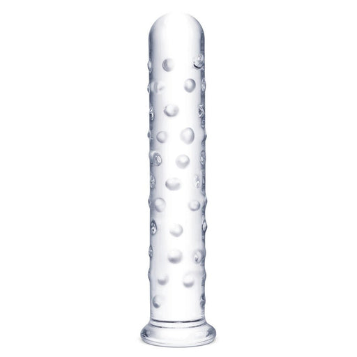 The nubby textured shaft offers a unique sensation, enhancing pleasure with every thrust. Made from extra-sturdy glass, this dildo allows for temperature play—warm it up or cool it down for added sensations. Its flared base ensures safe use, while the fracture-resistant and hypo-allergenic material makes it durable and safe for all users.