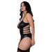 Command attention with the Lust Kira basque set from the Lust Fetish collection. This lingerie piece is crafted from a sleek, shiny stretch fabric that molds to the body, featuring an open-front design with bold nickel-plated metal studs and rings for an edgy, fetish-inspired look. Adjustable straps and attached leg garters allow for a customizable fit, while the matching classic thong completes the set. Designed for those who love to make a statement, this set is the perfect addition to any daring lingerie collection.