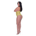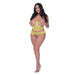 Elevate your intimate apparel with the Exposed by Magic Silk collection. This daring cupless bustier showcases whimsical star patterns, designed to captivate and intrigue. Featuring a corset-style hook and eye closure at the back, it ensures a flattering fit that accentuates your curves. Paired with a matching open crotch panty adorned with playful ruffle details, this set is perfect for those who love to blend fun and flirtation. Crafted from a stretchy neon chartreuse mesh, it's both comfortable and eye-catching. Experience the perfect combination of style and seduction with this irresistible ensemble. Materials: 85% Nylon, 15% Spandex.