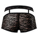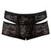 Enhance your men's lace underwear collection with the sinfully delicious Lucifer Cut Out Short by Male Power. Tantalizing peek-a-boo cutouts adorn this lace lingerie for men. Deluxe elastic trim amplifies the curlicue floral lace pattern by offering practical function with its pouch enhancing design and securing the waistband in back. In addition to function, there are decorative straps on the pouch and in the back creating a touch of butt cleavage.
