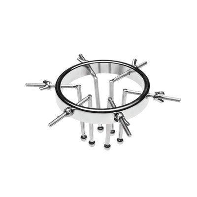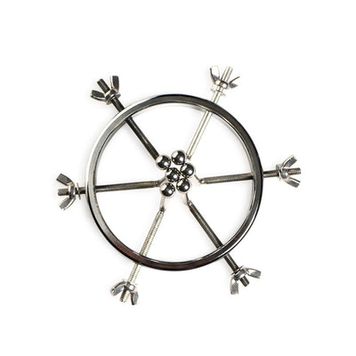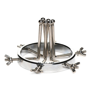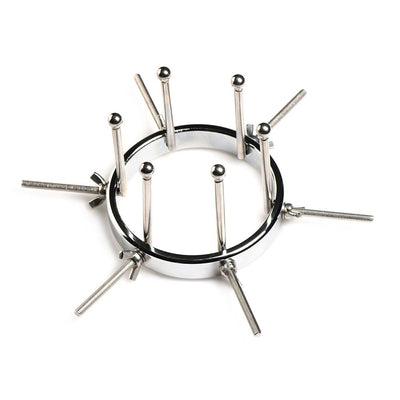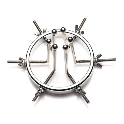 This stainless steel anal explorer is perfect for those into medical play who want to expand and stretch open their backdoor! Made out of strong, durable, non-porous, nickel-free steel, it's compatible with all lubricant types and is nonporous. The Anal Explorer consists of one large ring with a diameter of 4.1 inches and 6 dilators that have smooth rods with small, round, balls on the ends of them. Insert it almost 3 inches deep and spread their hole wide open! The ring is wide enough for you to fit your fist through, as well! Each dilator rod can be adjusted individually using the wingnuts to tighten or loosen the position on the screw. Only the smooth steel will be pressing against the sensitive tissue of the anus while the spiraling screws are outside against the buttocks. To clean after use, rinse with warm water and mild soap or boil it in water. Then spray it with isopropyl alcohol and wipe clean. Grab plenty of your favorite lube and prepare the Anal Explorer by rubbing the round ball ends and rods with it. Don't let any get on the wingnuts or it will be difficult to grip them to adjust. Insert it inside the anus while the dilator prongs are close together and not expanded. Once inside, slowly adjust to widen and expand. Do this slowly and add lube as you get wider. Listen to your partner and remind them to breathe. Do not go beyond their limit or it can cause tearing. If you can open it all the way, you can try fisting. Make sure your nails are trimmed and there are no open cuts on your hand before dipping your fist in lube and going inside. Have fun and play safe! Measurements: Insertable length: 2.9 inches. Dilators expand from 1 inch to 4.1 inches in diameter. Center ring inner diameter: 4.1 inches. Materials: Stainless steel Color: Metal