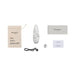 Package Includes: USB charging cable (AC adaptor not included), additional stimulation head, quick start guide, safety instructions, and a cotton storage pouch.